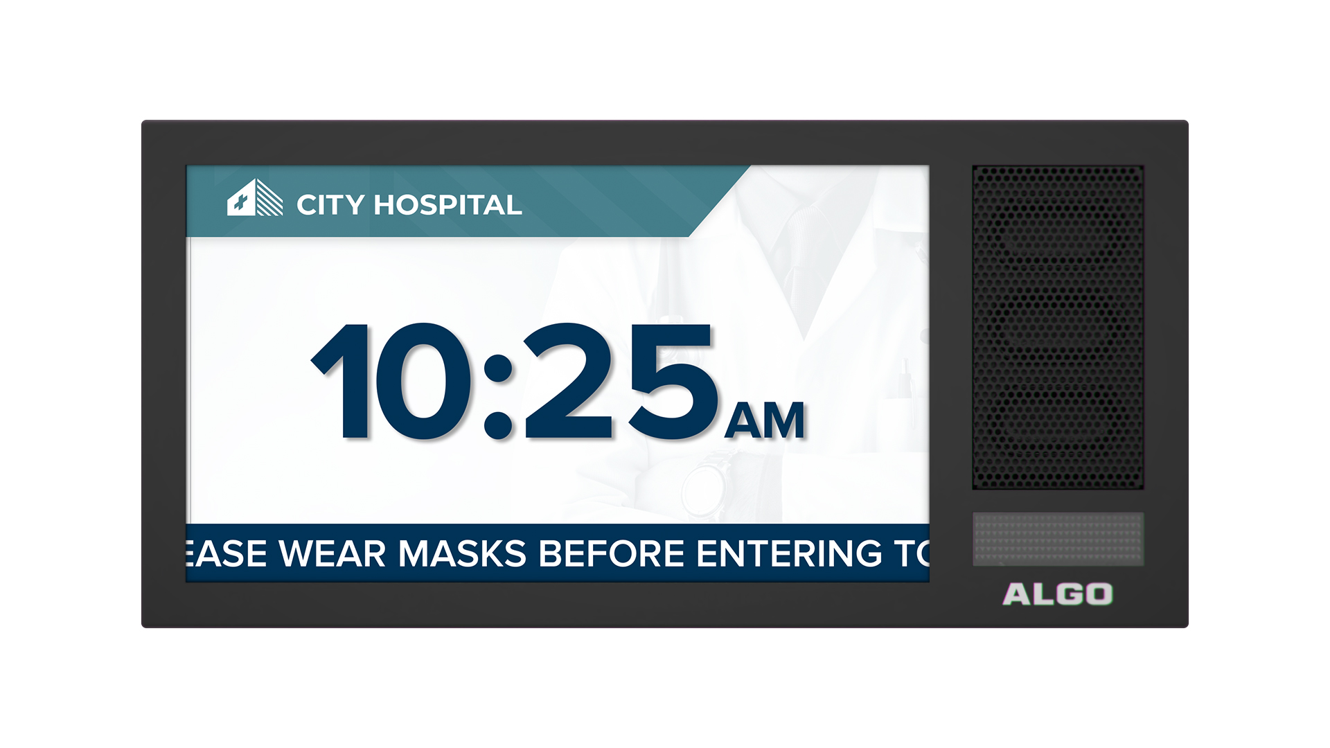 In a hospital, the IP Display Speaker can be used for both audible and visual alerting. Audible alerting can be used to inform staff, patients, and guests of general information through paging and pre-recorded audio messages. Visual alerting can be used to complement audio or on its own, displaying pertinent information or messaging down corridors or in hospital wings where noise sensitivity needs to be considered.