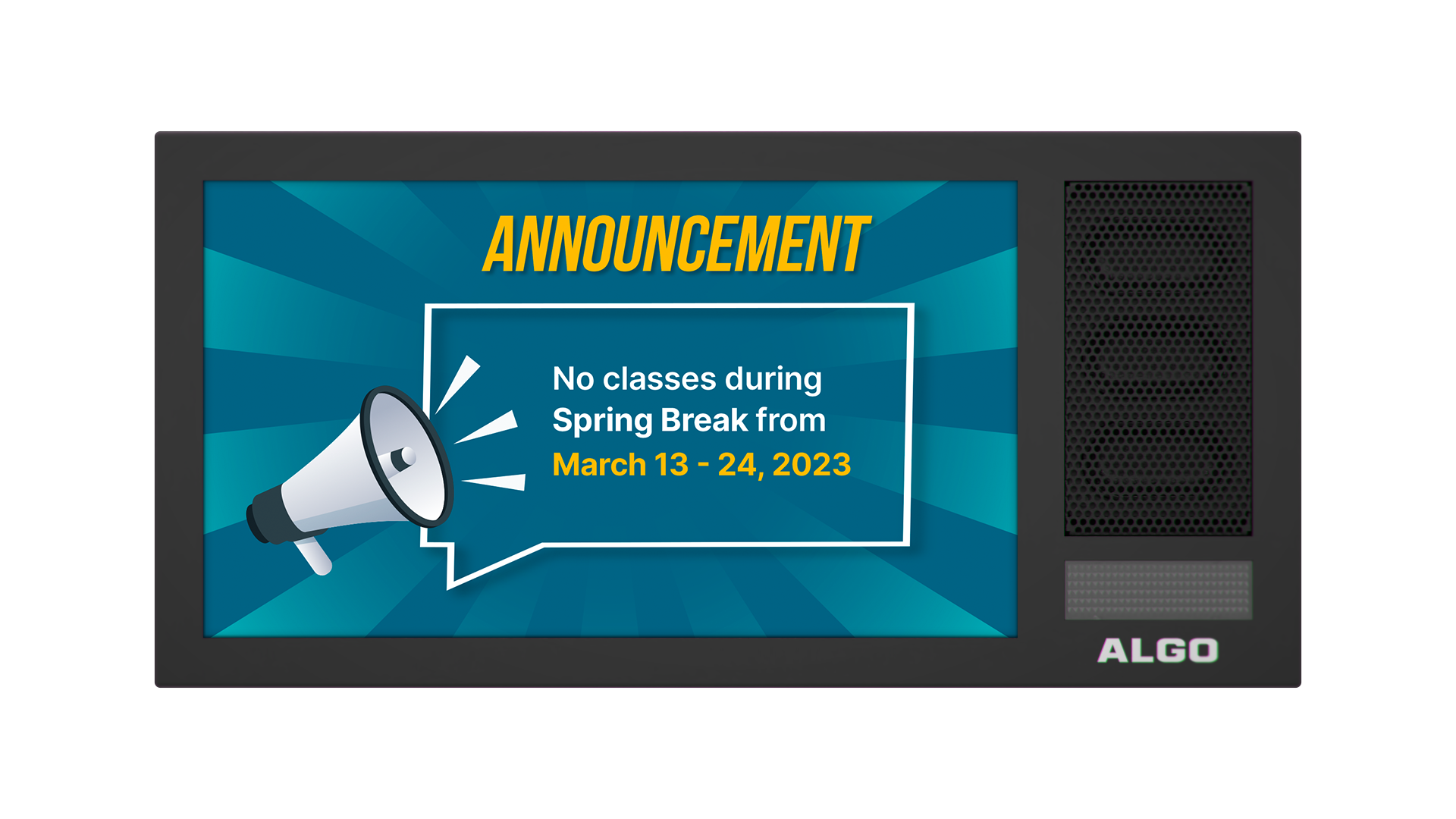 A number of preloaded display options are available, such as lockdown, emergency, weather alerts, etc. However, the LCD screen is fully customizable to allow for communication with specific branding and environmental requirements.