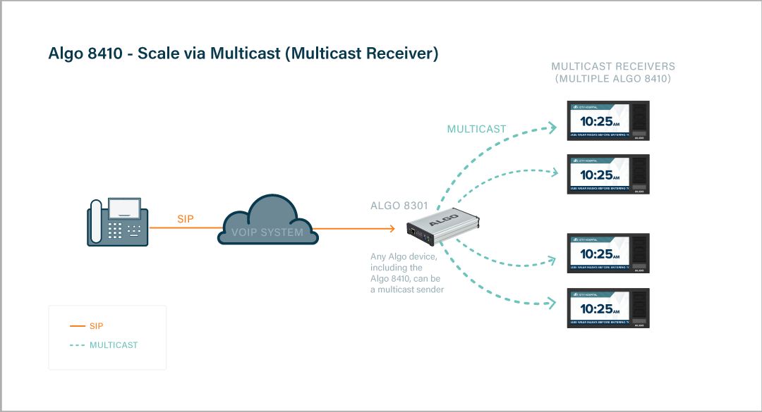The 8410 IP Display Speaker supports multicast send or receive. As a result, many Algo IP Display Speakers can be deployed to cover any size building, campus (e.g., classrooms in a school, college or university), or enterprise. There is no limit to the number of devices part of a multicast, and a minimum of network traffic activity is utilized.