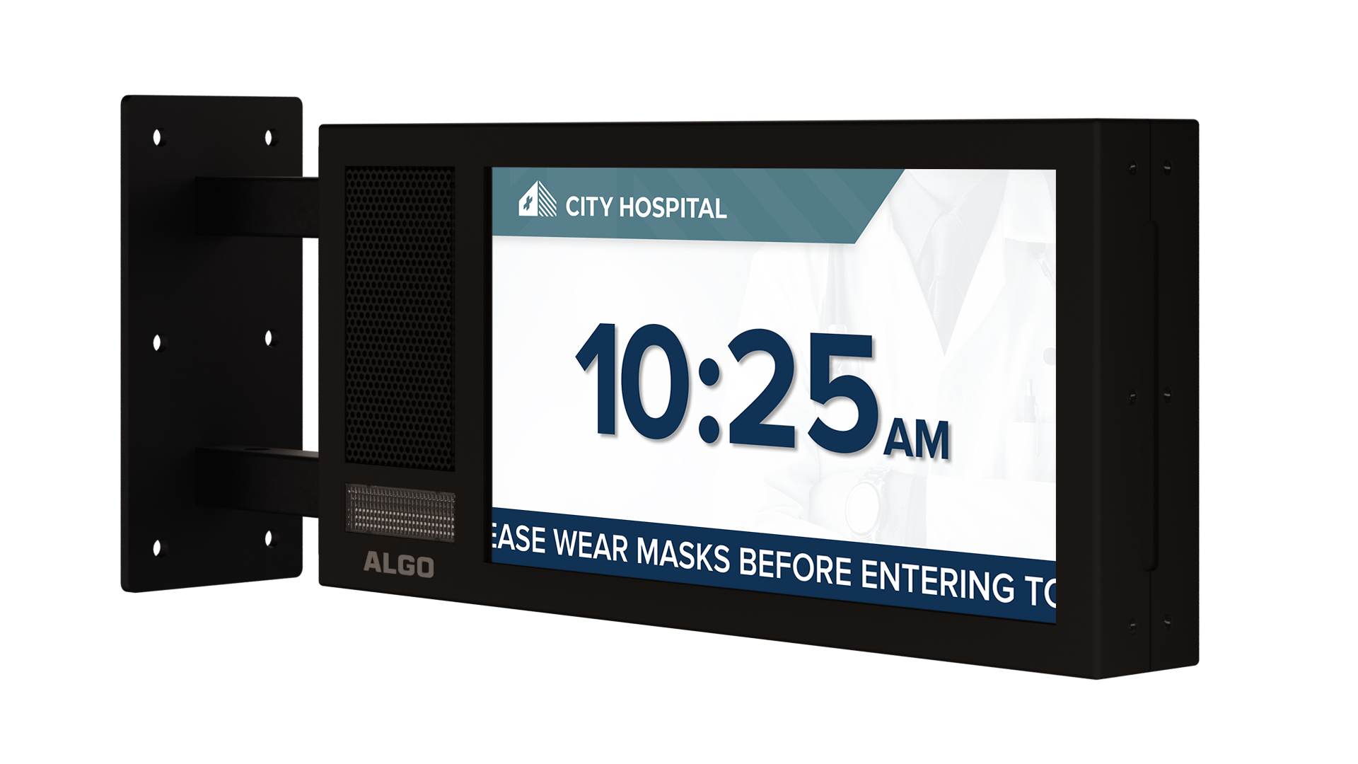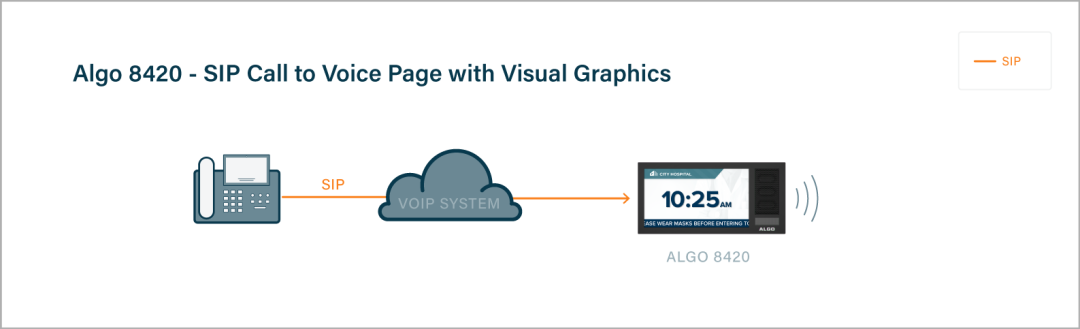 In a hospital, the 8420 IP Display Speaker can be used for both audible and visual alerting. Audible alerting can be used to inform staff, patients, and guests of general information through paging and pre-recorded audio messages. Visual alerting can be used to complement audio or on its own, displaying pertinent information or messaging down corridors or in hospital wings where noise sensitivity needs to be considered.