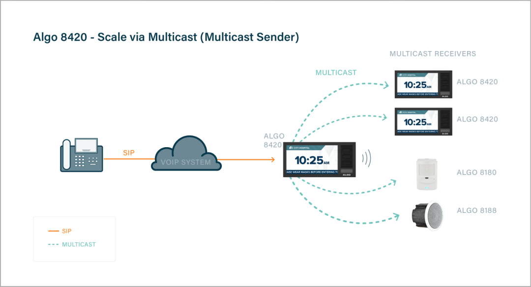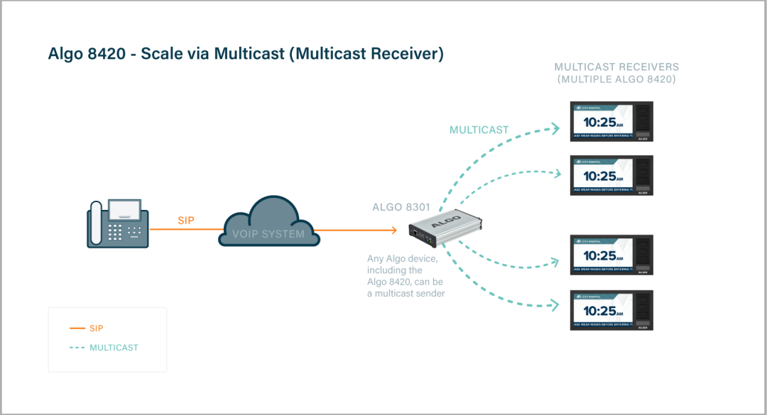 The 8420 IP Dual Sided Display Speaker supports multicast send or receive. As a result, many Algo IP Dual-Sided Display Speakers can be deployed to cover any size building, campus (e.g., classrooms in a school, college or university) or enterprise. There is no limit to the number of devices part of a multicast, and a minimum of network traffic activity is utilized.
