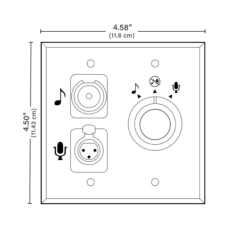 A rotary control knob on the Audio Interface has three positions for music, microphone and off. The 8301 will automatically detect the control knob position to start playing audio for either the microphone or music input as selected or stop playing audio in the off state.