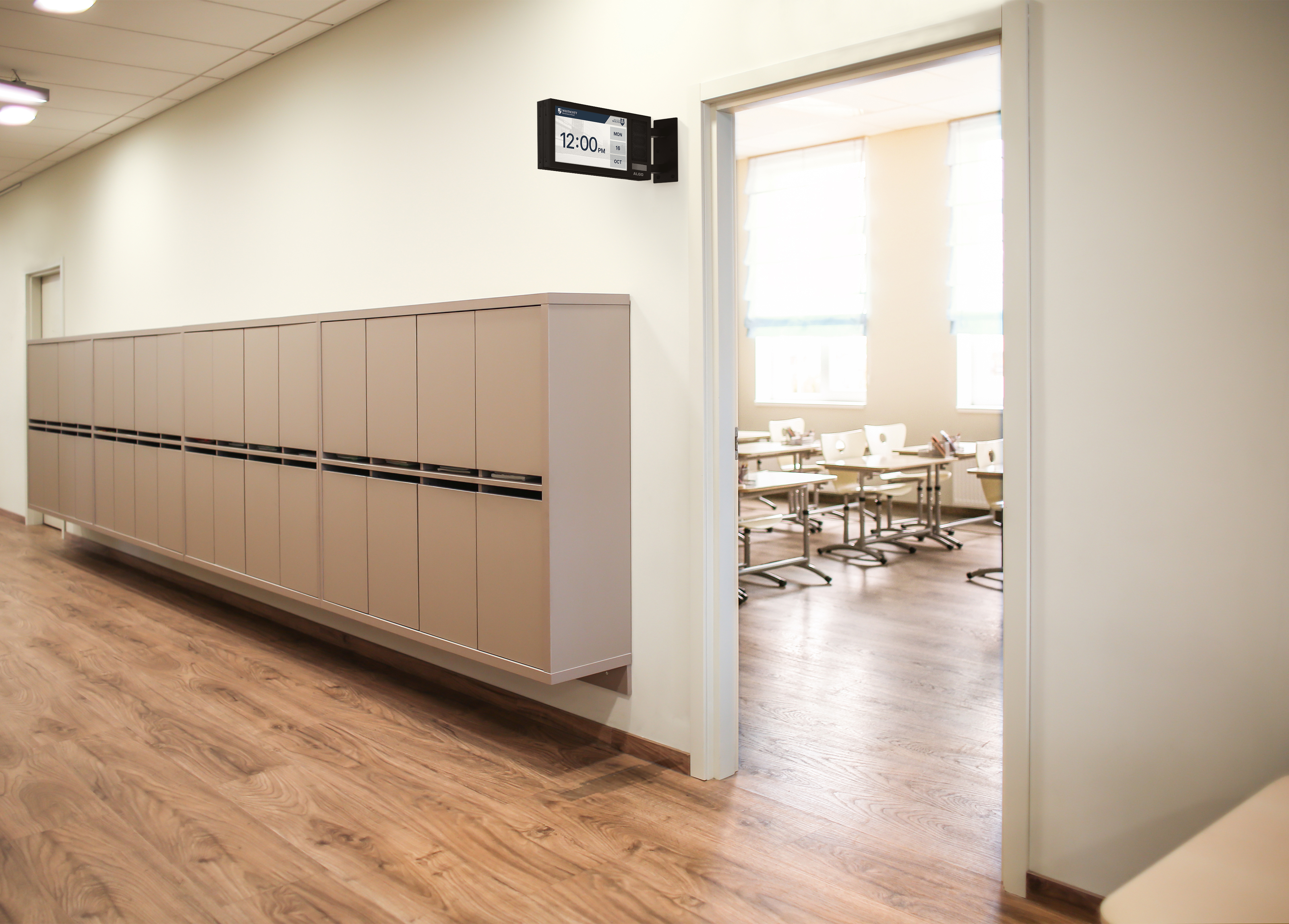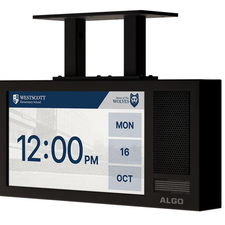 For classrooms that require both audible and visual communication, the Algo 8410 IP Display Speaker combines voice paging with on-screen messaging using a wide-angle LCD screen. Display options include reminders, announcements, clock faces, and scrolling text to reinforce audible alerts.