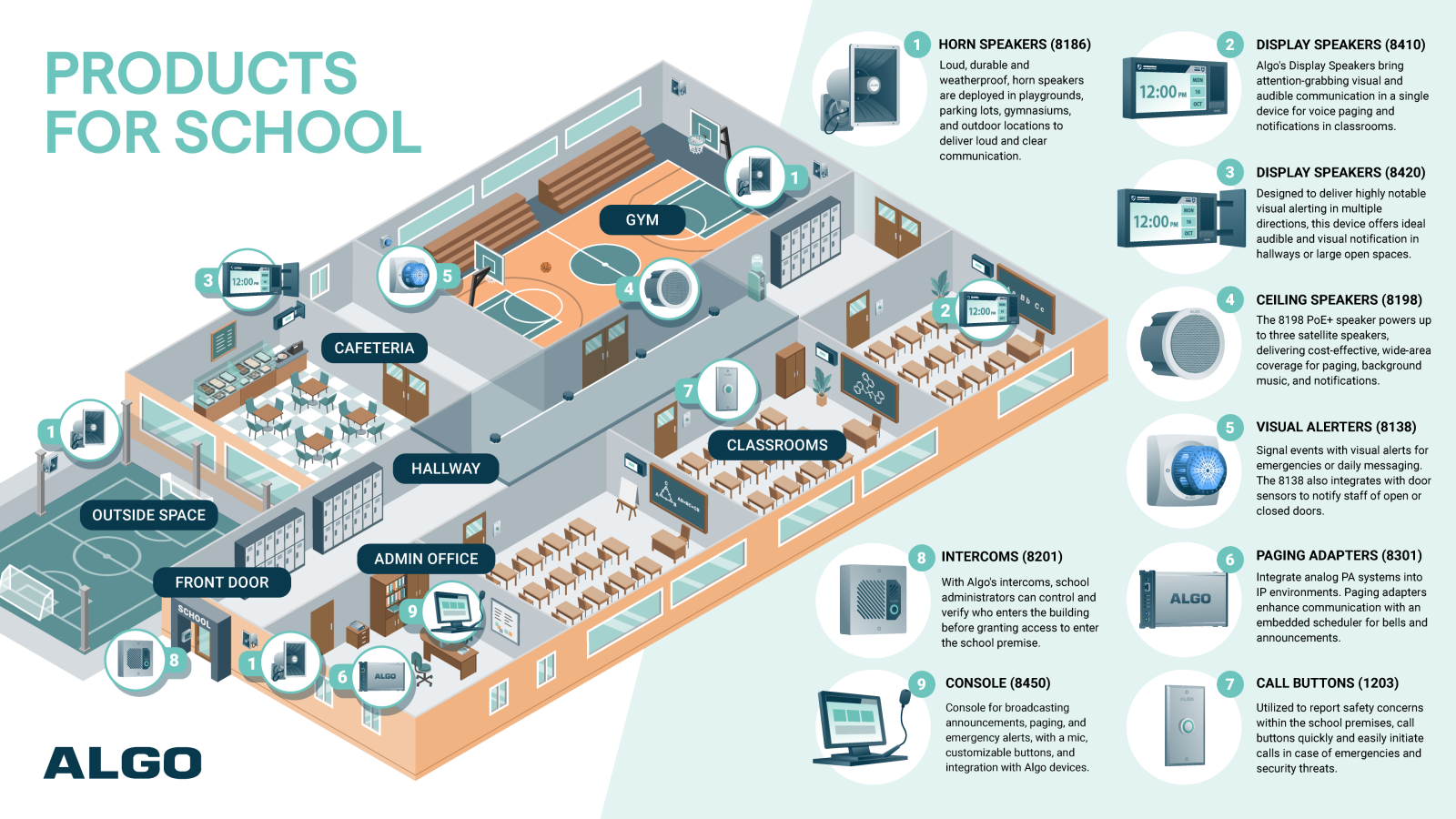 Discover Algo IP Endpoints for K-12 and higher education communication. From IP speakers and visual alerters to intercoms and call buttons, Algo offers VoIP solutions for schools to build a flexible ecosystem for voice paging, emergency notification, visual alerting, and secure door entry. Algo IP solutions support reliable, scalable communication across classrooms, campuses, and common areas.