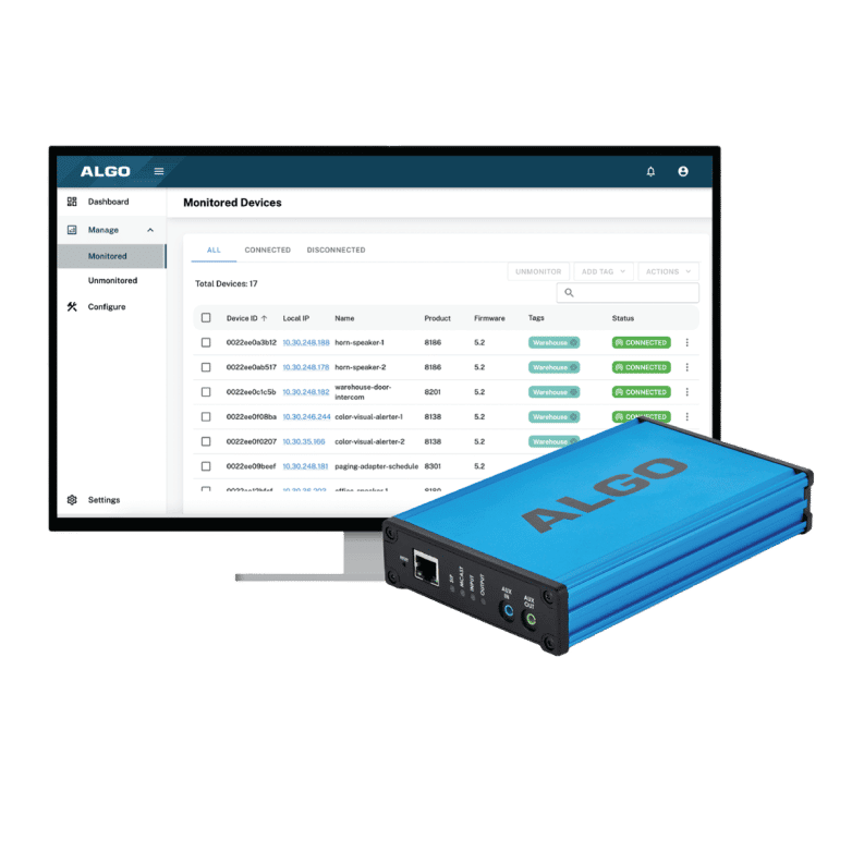 Algo provides user-friendly management tools to configure and monitor IP Endpoints. Devices can be managed individually through a web-based interface or in groups when integrated into the Algo Device Management Platform (ADMP). This simplifies installation, configuration, and ongoing maintenance. The ADMP allows integrators to oversee multiple schools in a district or buildings on a campus all from a single location. As a virtual device monitoring tool, the ADMP enables integrators to monitor and manage devices on the registered network from any location.