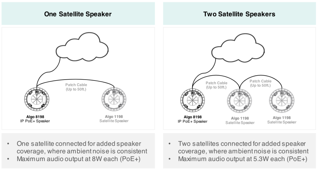 When deploying satellite speakers, it is important to consider your application and maximum audio output requirements before choosing a configuration. For maximum output select all IP speakers, for maximum cost savings deploy three satellite speakers per IP speaker. See how the number of satellite speakers impacts audio output here.