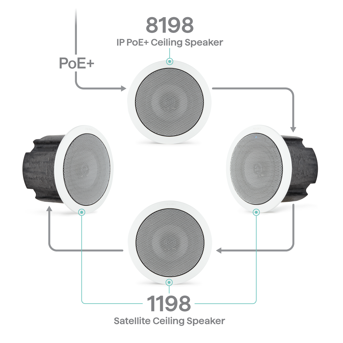 The 8198 IP PoE+ Ceiling Speaker is a SIP compliant and multicast capable PoE+ network audio device for live voice paging, alerting, announcements and emergency notification. For expanded coverage, up to three 1198 Satellite Ceiling Speakersย may be connected to the 8198, providing cost-effective deployment with consistent acoustic performance across larger environments.