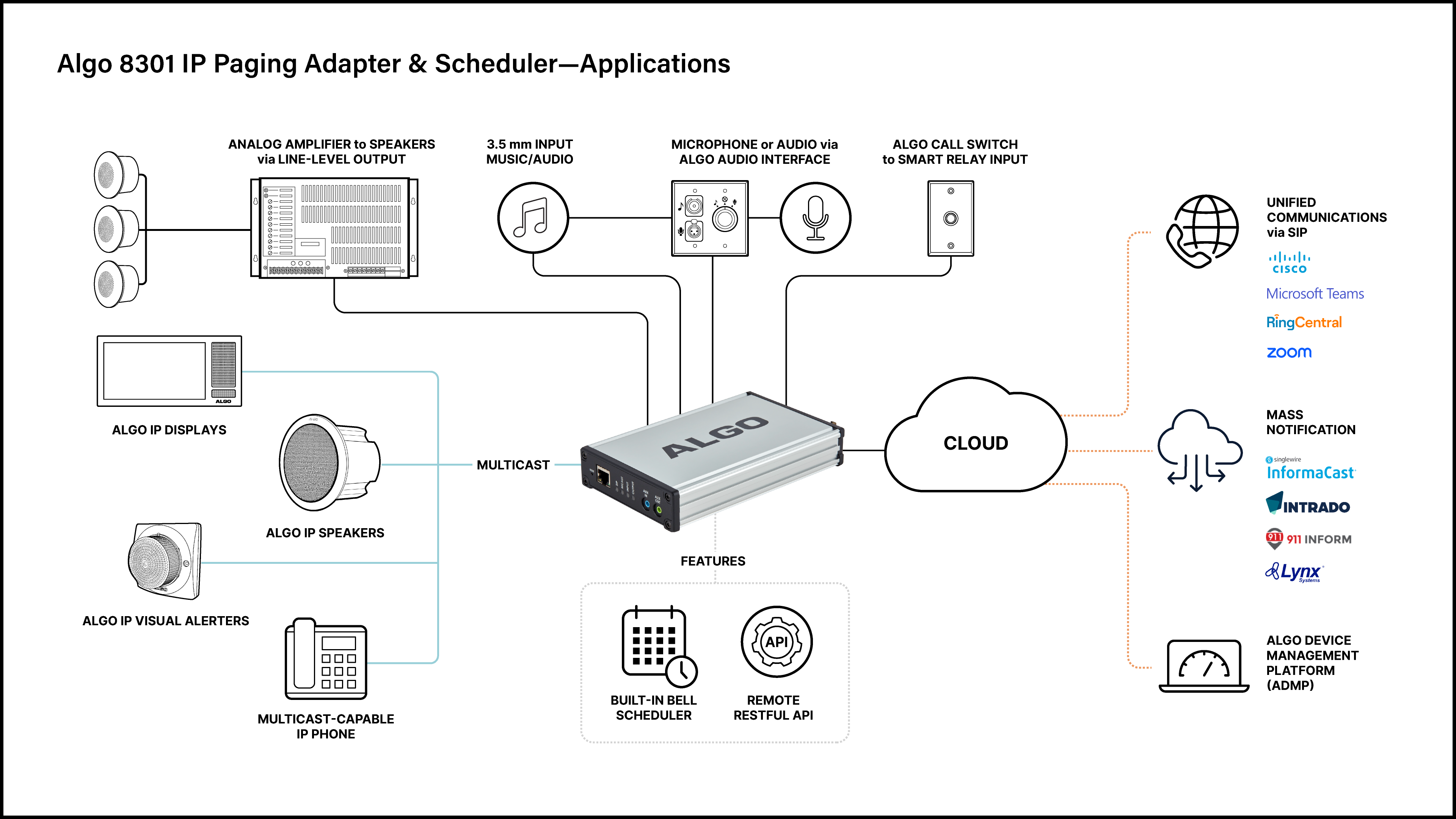 The Algo 8301 SIP Paging Adapter & Scheduler is also sold as the Algo 8301-IC InformaCast SIP Paging Adapter & Scheduler, a fully InformaCast Compliant endpoint for integrating legacy analog amplifiers. The adapter is also a fully compliant 3rd party SIP endpoint. As a result, the Algo 8301-IC InformaCast SIP Paging Adapter & Scheduler is compatible with most hosted / cloud and premise-based VoIP telephone systems.