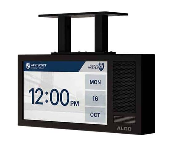 In education settings, the IP Display Speaker can be installed in individual classrooms as well as high-traffic locations, such as hallways, cafeterias, and libraries. In a classroom, the features of the IP Display Speaker can ensure that building occupants are notified of the events in the school. The basic display shown on the screen can be set to a customizable image with the school branding, can display a slideshow of news events relating to the school, or can display a clock, either analog or digital.