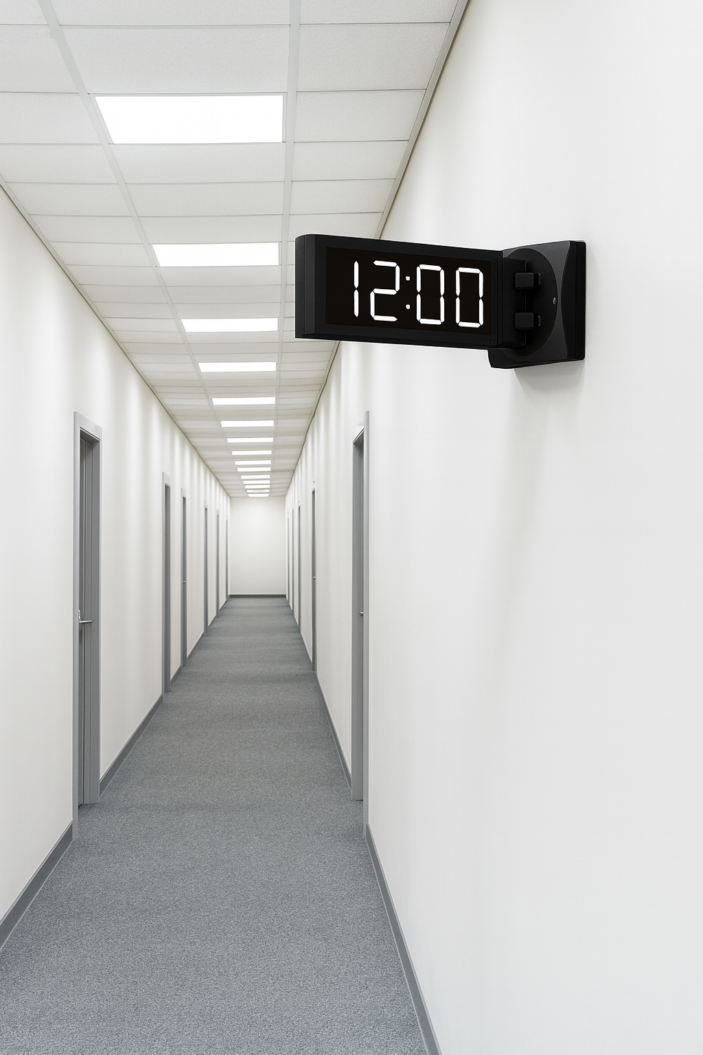 The 8402 model includes a dual-sided LED display mounted perpendicular to the wall, making it ideal for hallways, lobbies, and open areas where visibility from multiple angles is required. Both models provide a clear four-digit readout of hours and minutes for accurate timekeeping across facilities.