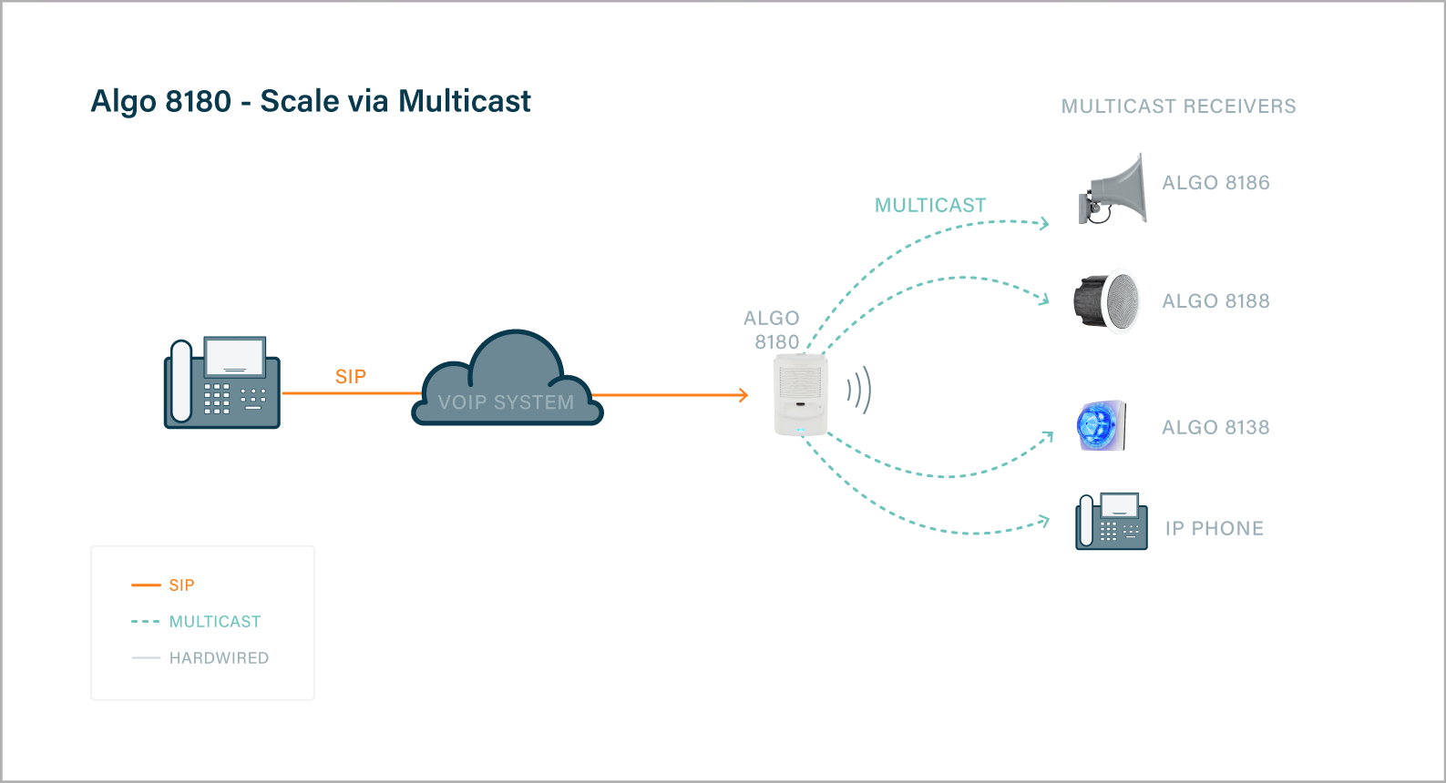 The 8180-IC together with other InformaCast endpoints are scalable to meet the needs of any size project. Algo IP InformaCast compliant endpoints support multicast send or receive. As a result, many Algo IP endpoint can be deployed to cover any size building, campus, or enterprise.ย There is no limit to the number of devices part of a multicast, and a minimum of network traffic activity is utilized.