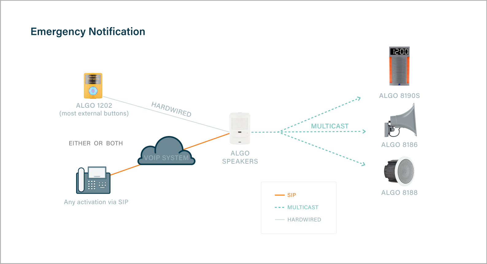 Multicast provides cost effective scalability using a minimum of SIP registered endpoints, as only the endpoint designated to send the multicast needs to be registered. Devices configured to receive the multicast do not need registration. Any combination and number of Algo IP endpoints can be configured as a multicast for emergency alerting to cover any size room, building, campus or enterprise.