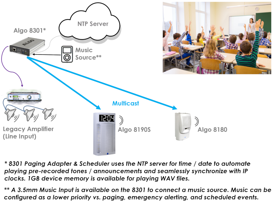 Together with the Algo 8301 SIP Paging Adapter & Scheduler, a public address (PA) system requiring multiple zones with scheduled bells / announcements can be easily configured and synchronized with IP clocks using the 8180 and other Algo IP speakers.